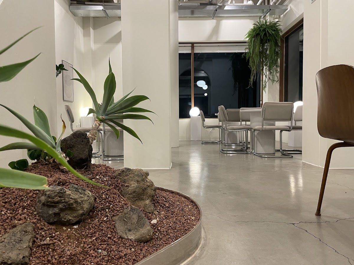 As you step inside, you are immediately greeted by a bright, clean aesthetic that features white walls and an inviting ambiance. The space is adorned with large windows that frame a scenic view of lush green mountains, making it the perfect backdrop for your coffee break. The calming music playing softly in the background enhances the overall atmosphere, transporting you to a haven of relaxation.